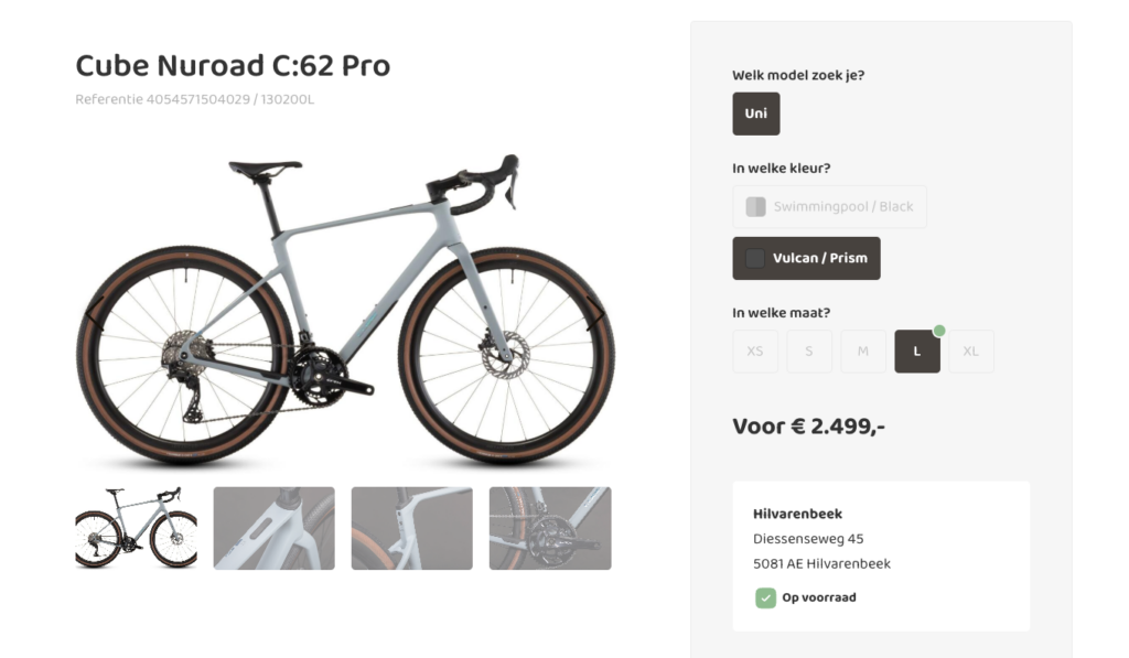 Heldere filters en selectiemogelijkheden helpen de bezoeker stap voor stap naar de juiste keuze. Denk aan het eenvoudig selecteren van een framemaat met bijbehorende lengterichtlijn, het direct zien welke kleuren op voorraad zijn of het vergelijken van accu-opties met actieradius-indicatie. Door opties visueel en inhoudelijk goed te begeleiden, voelt het keuzeproces logisch en overzichtelijk in plaats van technisch of overweldigend.