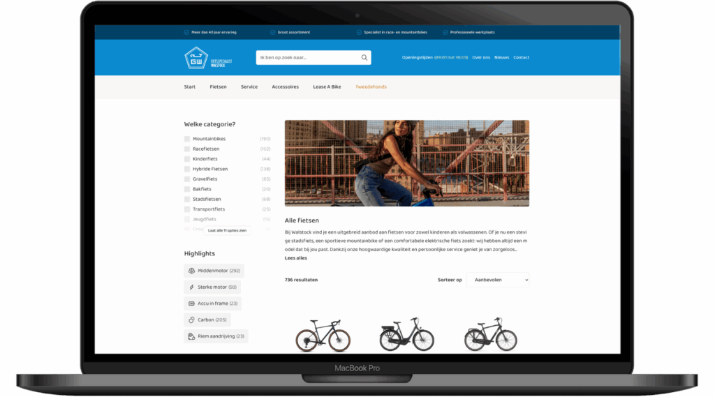 Voor Walstock is de website een essentieel verlengstuk van de winkel. Veel oriënterende klanten starten hun zoektocht naar een nieuwe fiets op hun smartphone — thuis op de bank, onderweg of zelfs al in de winkel. Daarom is de website ontworpen met een sterke focus op mobiele gebruiksvriendelijkheid en overzicht.