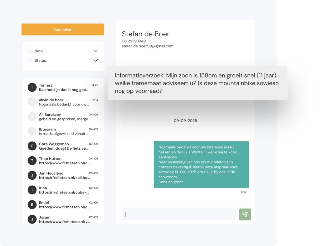 Met ons platform mis je nooit meer een kans. Alle chats, informatie-aanvragen en inruilvoorstellen – bijvoorbeeld voor auto’s – komen rechtstreeks binnen in één overzichtelijke inbox. Geen losse e-mails of berichten meer via Marktplaats en andere apps: je reageert vanuit één plek, snel en professioneel. Zo houd je overzicht, werk je efficiënter en vergroot je de kans op nieuwe klanten.
